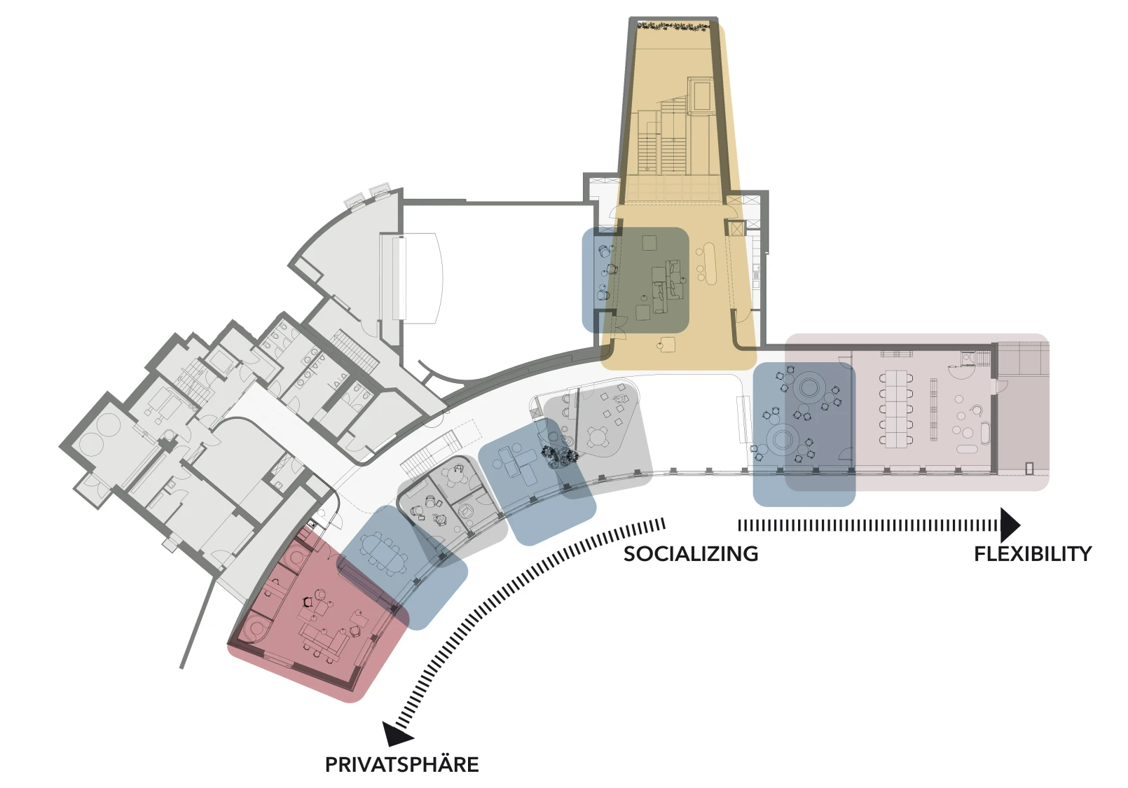 Das Nutzungskonzept umfasste verschiedene Bereiche wie Superflex Spaces, Auditorium, Breakout- und Workshop-Bereiche, Privacy Zones, Elastic Spaces, Socializing- und Gesundheitsbereiche.