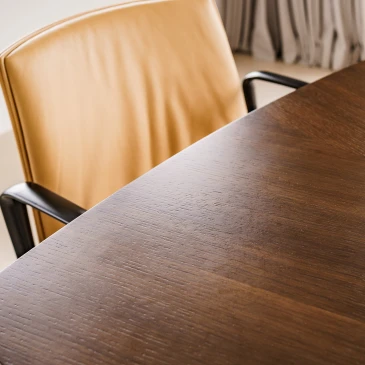 Nahtlos fügen sich hier die spezialangefertigten Tische mit den vielen versteckten Features in das elegante Raumambiente ein.