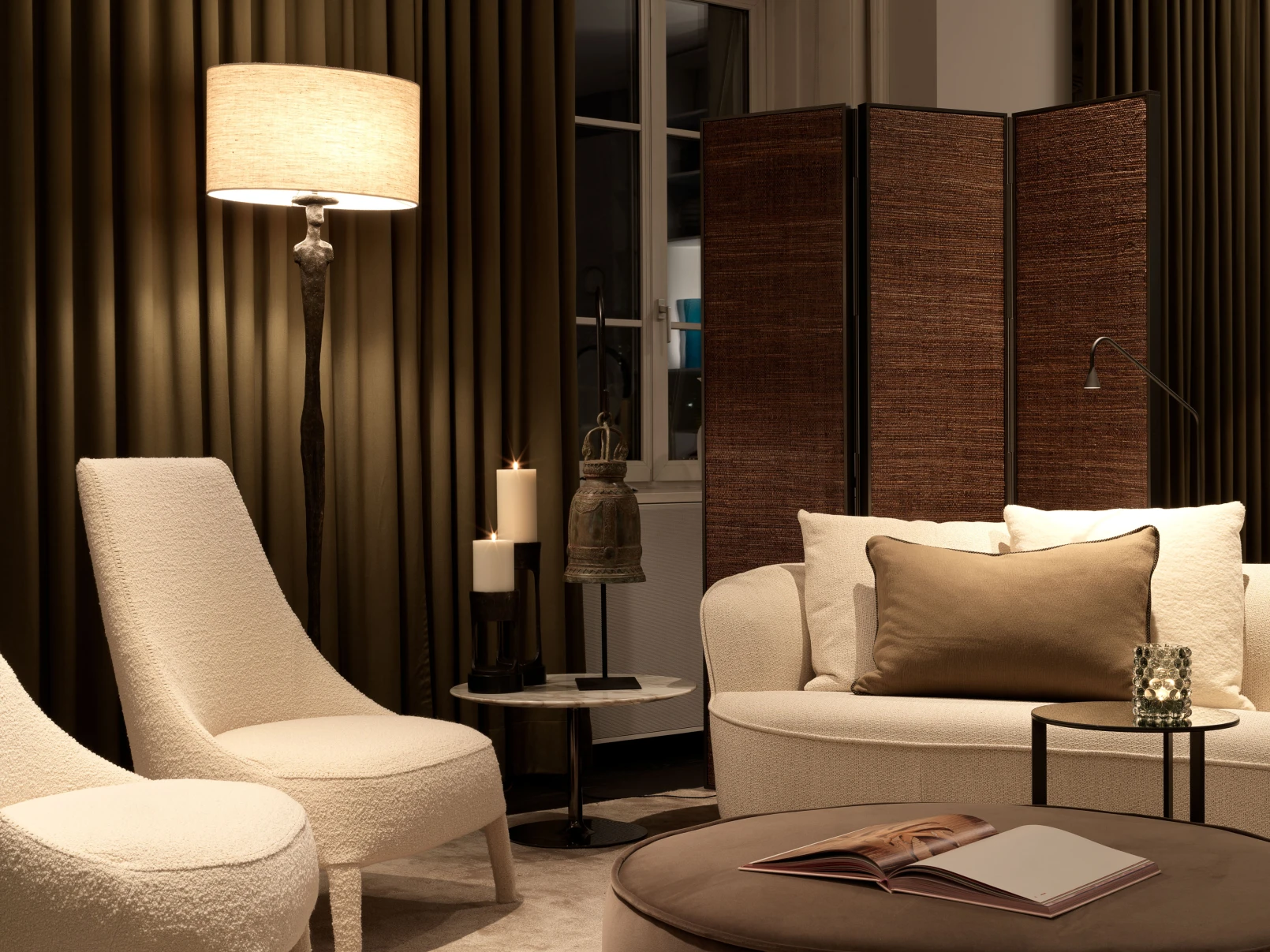 The new products from Maxalto (FEBO armchair, LILUM sofa, NIDUS pouf) create an inviting ambience and a cosy atmosphere. The unique GIACOMETTI lamp is from Porta Romana, the bell is a unique piece with its own history.