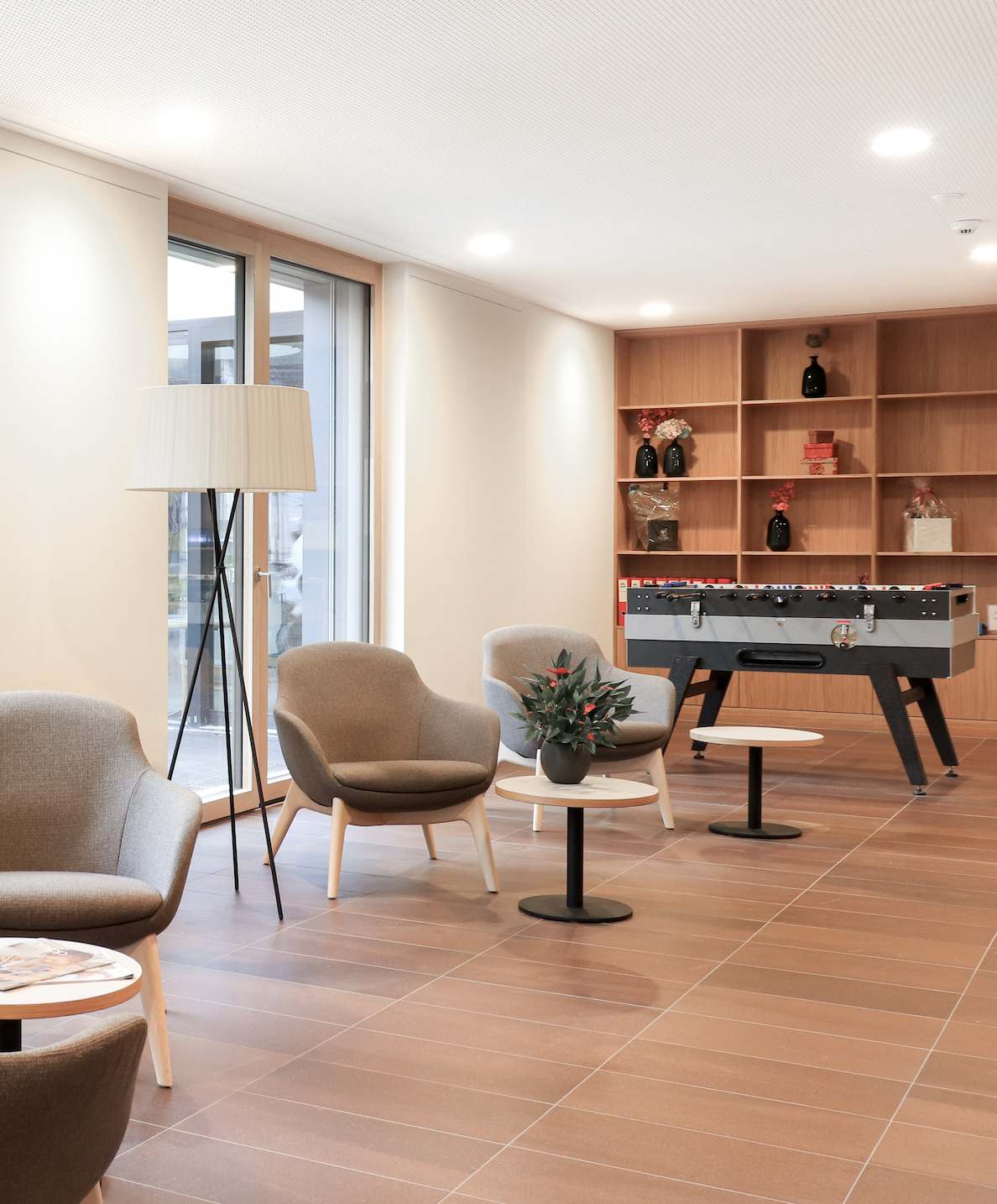 Um solche Projekte gelungen zu verwirklichen, gilt es zwei weitere wichtige Faktoren bereits früh in der Projektphase zu berücksichtigen: die menschliche Wahrnehmung und die Bedürfnissättigung. Die Architektur von Räumen kann hier sowohl präventiv, kurativ oder auch rehabilitativ wirken. Gemäss den Studien von Evans & Mitchell McCIn order to successfully implement such projects, two other important factors must be taken into account early in the project phase: human perception and the saturation of needs. The architecture of rooms can be preventive, curative or rehabilitative. According to the studies by Evans & Mitchell McCoy (1998), there are five essential design parameters that strongly influence sensory and neurological perception - and are therefore indispensable: stimulation (how intensively we experience our environment), affordance (to which reactions and actions the space animates us), coherence (how coherent is a space and how oriented we feel in it), control (what influence we can take on the space and adapt to our needs) and recreation (how much the stress and cognitive fatigue reduction succeeds). oy (1998) sind es in der Umsetzung fünf essenzielle Gestaltungsparameter, die die sensorische und neurologische Wahrnehmung stark beeinflussen – und deshalb unverzichtbar sind: Stimulierung (wie intensiv erleben wir unsere Umwelt), Affordanz (zu welchen Reaktionen und Handlungen animiert uns der Raum), Kohärenz (wie stimmig ist ein Raum und wie orientiert fühlen wir uns darin), Kontrolle (welchen Einfluss können wir auf den Raum nehmen und an unsere Bedürfnisse anpassen) und Erholung (wie stark gelingt die Stress- und kognitive Müdigkeitsreduzierung).