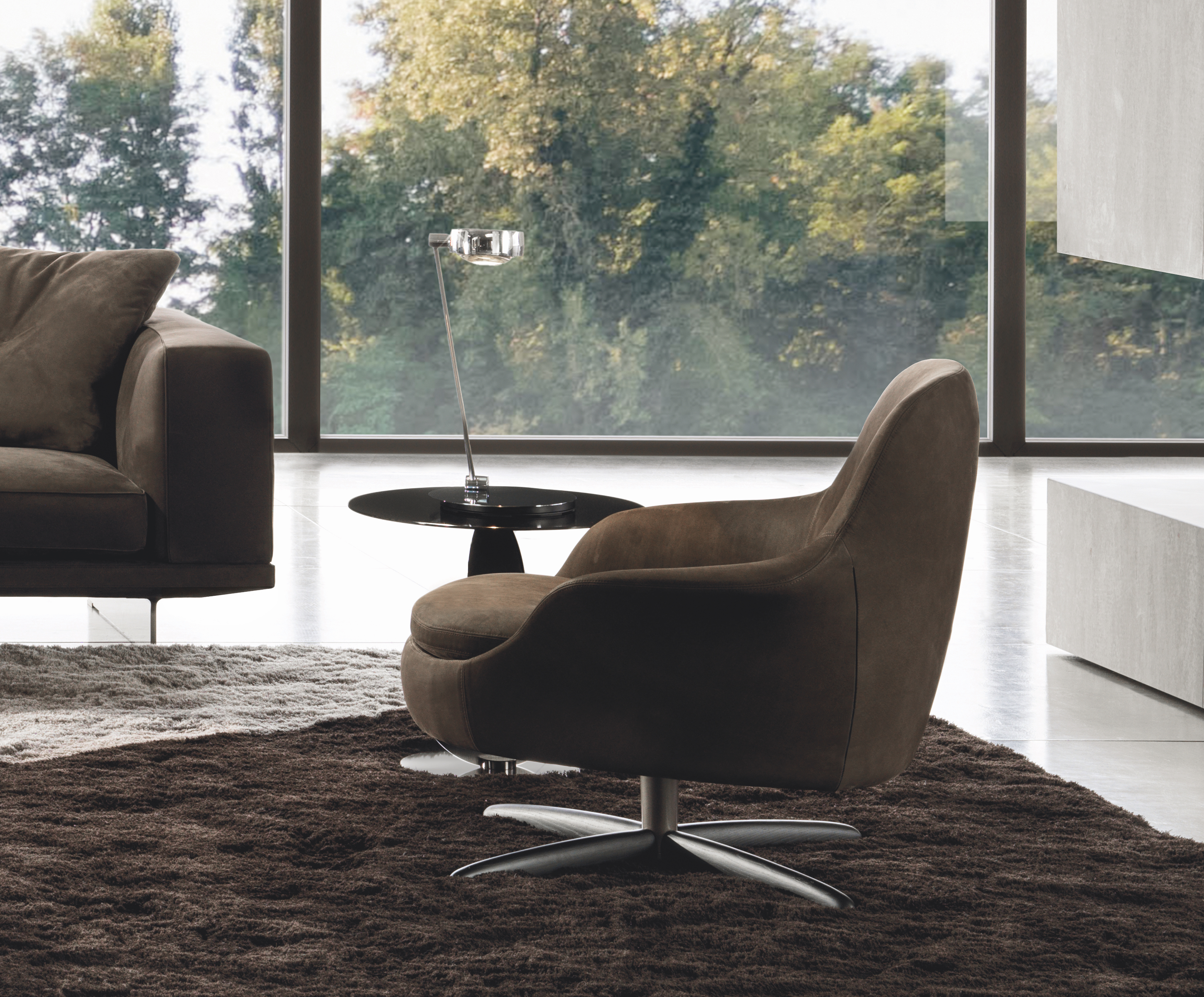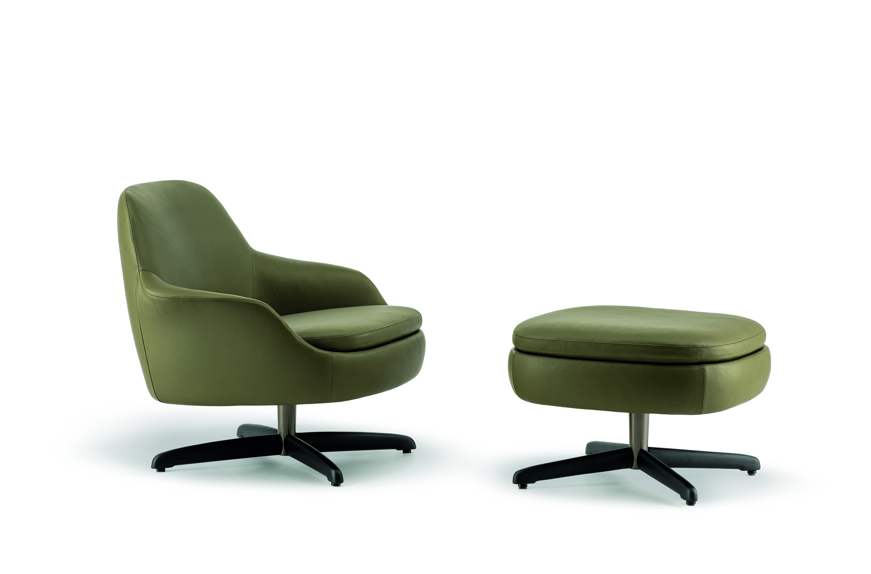 From the elegant and airy SENDAI seating furniture family come a new sofa, a comfortable swivel armchair with armrests and a footrest. The slender, harmonious wooden legs that characterise the Sendai family also become iconic elements here. The design of the armchair, whose upholstered shell rests on a 360-degree swivel base with return function, stems from the desire for a larger seat. Its comfort is ensured by a higher backrest and the presence of comfortable armrests, which also guarantee a satisfying feeling of relaxation in combination with the footrest.